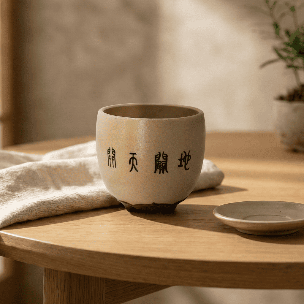 The Object: Shaped perfectly like an egg—the universal symbol of life and potential. The glaze is a primitive, warm beige, evoking the raw earth. On the front, the ancient seal script "开天辟地" (Creation of the World) is hand-written in bold black ink, grounding the vessel with thousands of years of legend.