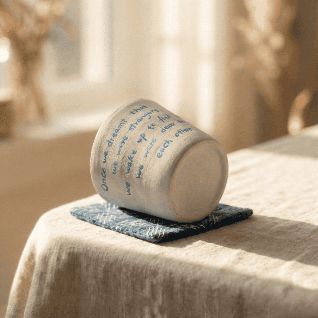 The Object: Minimalism at its most profound. A simple, matte white vessel serves as the canvas for handwritten blue text. The "typography" is imperfect and human, looking as if the poet just finished writing on the cup with a fountain pen.