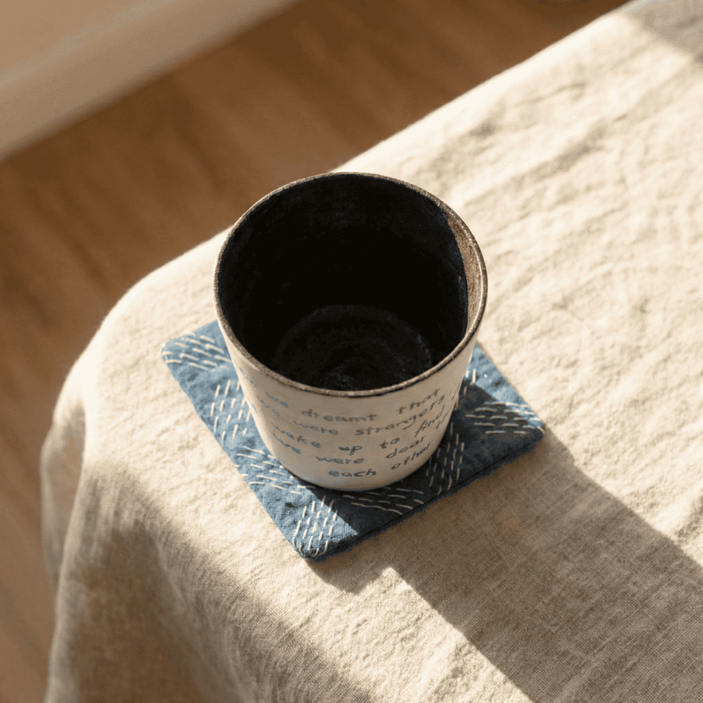 Handwriting on clay feels incredibly intimate, like a letter sent across time. I chose Tagore's lines to wrap around the vessel, so that with every turn of the cup, you are reminded that even in a lonely city, we are all connected.